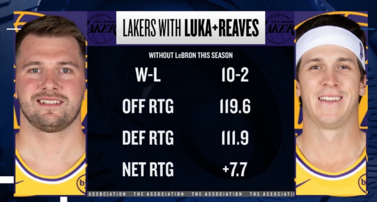 本季詹姆斯缺席东契奇&里夫斯出战 湖人净效率+7.7 进攻效率119.6
