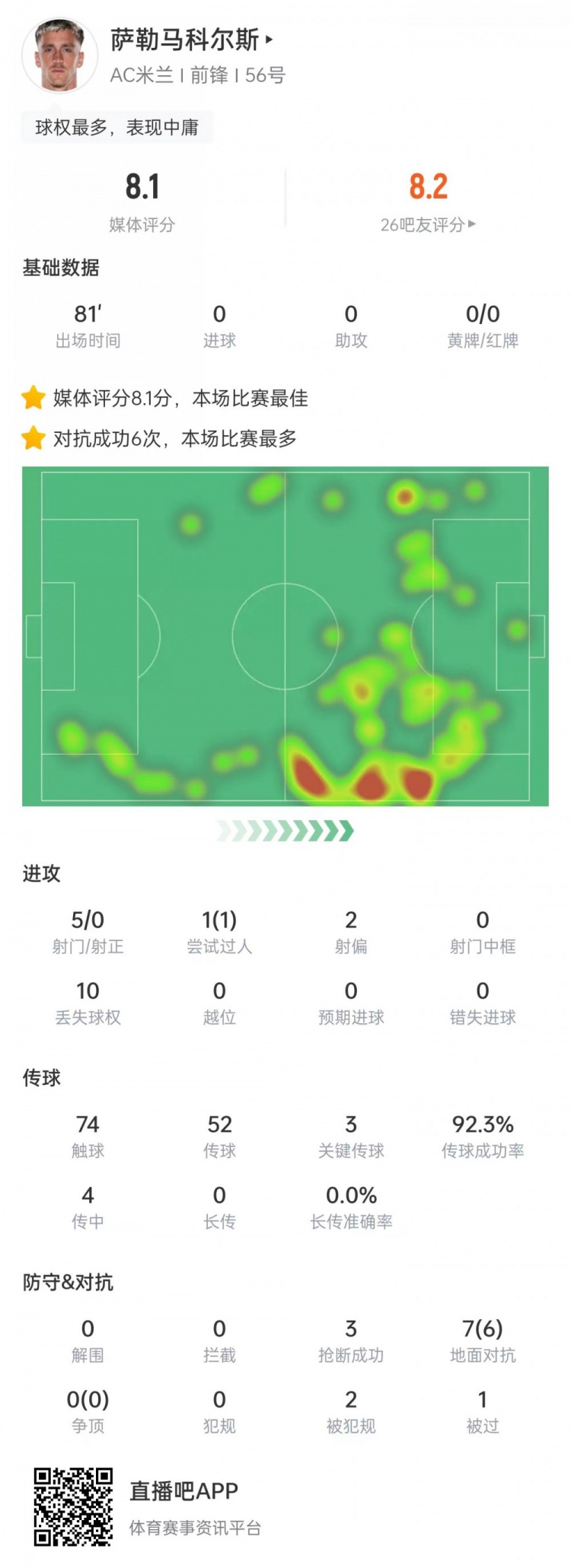 博鱼电竞-3次关键传球!萨勒马科尔斯当选意杯首轮米兰队内最佳球员