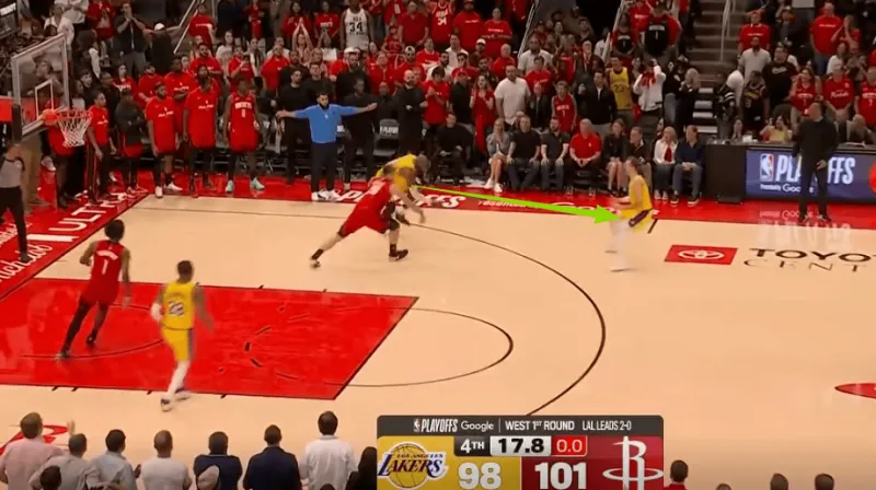 斯玛特推进过半场后落位强侧45°持球发牌,弱侧的詹姆斯随即抓“早期进攻阶段”发动传切战术配合:詹姆斯先是佯装借助海斯无球掩护兜至弧顶(执行“Wide Action”战术)误导追防的伊森,在伊森准备挤过掩护墙的瞬间,老詹立即反跑空切篮下摆脱伊森长驱直入如入无人之境(这里的细节是:海斯“Trailer”过半场后留在弧顶准备设置掩护将禁区拉空+八村沉至弱侧底角使得谢泼德成为弱侧的LowMan。),